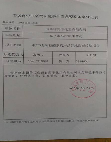 我公司制定的《山西省高平化工有限公司突發(fā)環(huán)境事件應急預案》于2013年12月25日在晉城環(huán)保局備案。